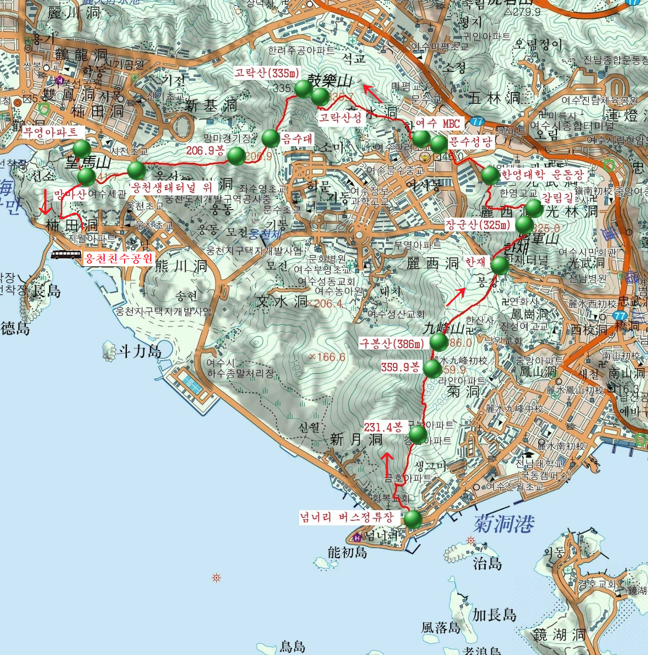 산행코스 : 구봉산-한재-장군산-한영대-여수MBC-고락산-생태터널-망마산-웅천근린공원주차장(11.5km,5h)